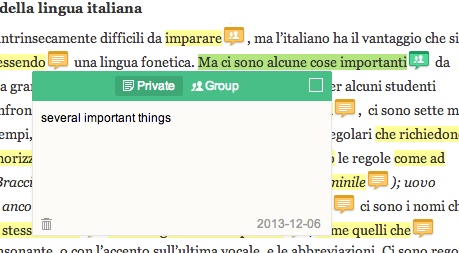I started using Diigo’s annotation features for my own learning when an Italian language exchange partner I met on polyglotclub.com sent me a link to an article he thought I might like to read in Italian. I started highlighting words or phrases I stumbled on in the article, and adding clarification in “sticky notes” attached to each. This in itself has been very powerful as self-learning tool. I then realized there were some that Google Translate couldn’t help with, and I needed help from my native Italian speaking exchange partner. So, I started highlighting words I needed help with in a different color, with questions “stuck” to them, and now we can easily find and offer help on troublesome language issues in each other’s online reading through a shared Diigo Group, where we can see each other’s annotations right on the web pages we are learning from.